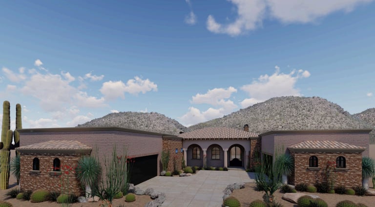 This design concept features a stunning Southwestern-inspired residential home, seamlessly integrated into the Arizona landscape. The home embraces a natural aesthetic with earthy tones, rustic brick detailing, and terracotta roof tiles that echo traditional desert architecture. The surrounding environment, with its rocky terrain and towering cacti, complements the design, creating a harmonious blend of indoor and outdoor living.